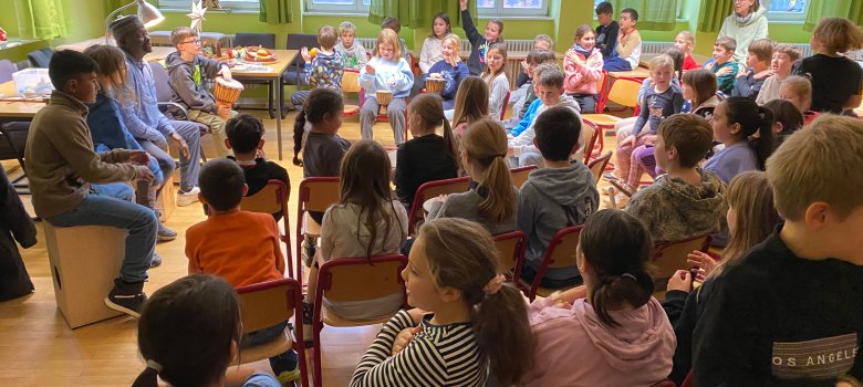 In gesonderten, fast eineinhalbstündigen Veranstaltungen erlebten die Schülerinnen und Schüler der Klassen 1 und 2 sowie der Klassen 3 und 4 jeweils eine altersgerecht gestaltete Lesung: Für die jüngeren Kinder öffnete Ndiaye eine fantasievolle, farbenfrohe Welt, in der sie durch Klatschen, Singen und Mitsprechen selbst zu Figuren der Geschichte wurden. Die älteren Kinder erhielten nicht nur spannende und humorvolle Impulse, sondern auch Denkanstöße zu Themen wie Respekt, Familiensinn, Freundschaft, Vielfalt kultureller Begegnung und wertschätzendem Miteinander.