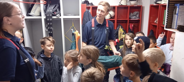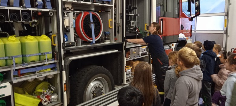 Sie erklärten den Schülerinnen und Schülern in kindgerechter Sprache die Gerätschaften im Feuerwehrauto, die Ausstattung der Feuerwehrfrau bzw. dem Feuerwehrmann und lud alle zu interessanten Experimenten ein. Ein Lernen mit allen Sinnen: Sehen und Staunen, Entdecken und Vermuten, Anfassen und Ausprobieren, …